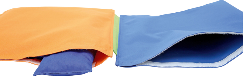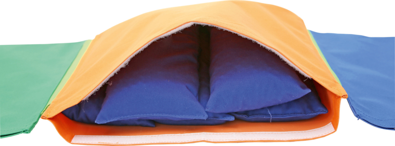 Artikelnummer: 101397 OverzichtKleurrijke katoenen mat met 5 zakken met klittenband. Het is mogelijk om ze te vullen met verschillende materialen (bonen, folie, kralen, schuim).