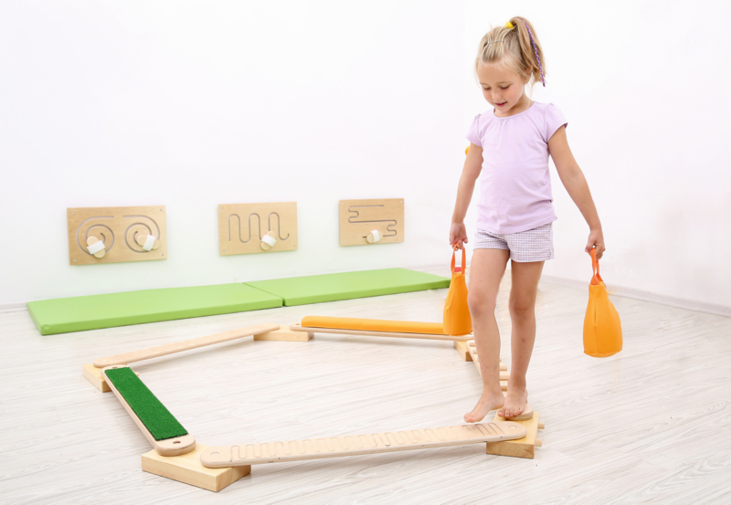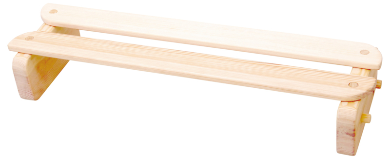 Artikelnummer: 126008 Overzicht5 platte stuks (afm. 94 x 9 x 2 cm) en 5 onderstellen met houten hangers (afm. 28 x 14 x 5 cm). Samen vormt dit een spoor om de balans te oefenen. De basis kan horizontaal en verticaal worden ingesteld.